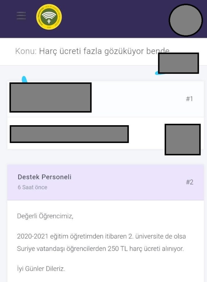 ملاحظة: الطلاب السوريين الحاصلين على الجنسية التركية تتم معاملتهم كمعاملات الطلاب الأتراك أي يعني يدفعوا 400₺ .
